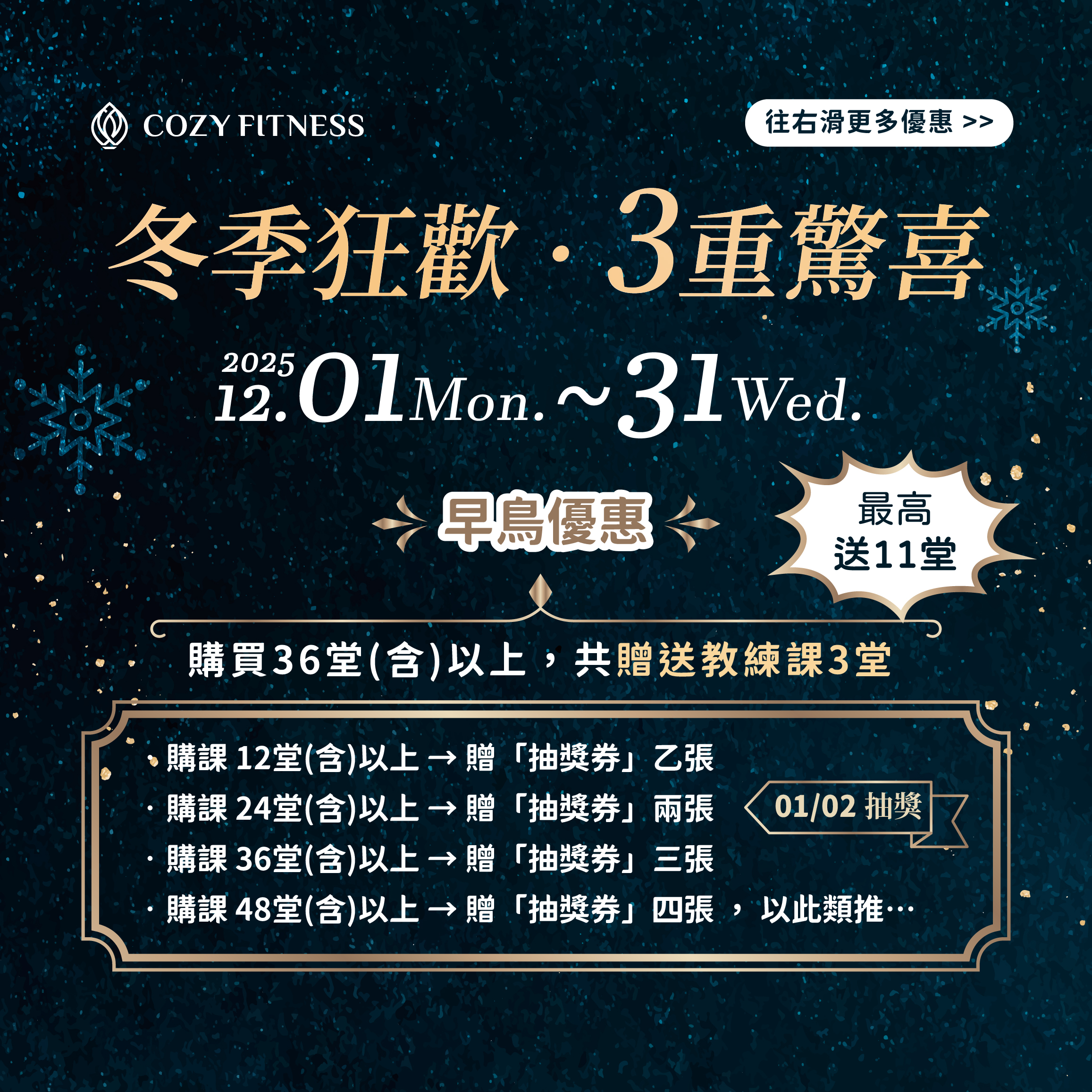 最新消息今年最後一檔優惠活動!!2025/12/03❄️ 12 月最後一檔!3 大年終驚喜等你解鎖 🎁✨ ✔ 早鳥優惠:買越多送越多,最高送到 11 堂 ✔ 冬夜盛典派對:限量 30 位,$399 入場再抽 $5,000 豪禮 ✔ 國家店 1 週年限定:新朋友 1+1 體驗課只要 $799 👉 立即查看 12 月優惠內容,開始你的改變旅程 🔥